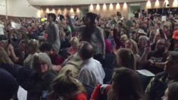 stampede - A sudden panicked rush of a number of horses, cattle, or other animals