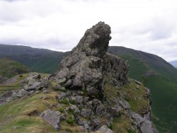 crag - A steep or rugged cliff or rock face