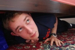 lurk - (of a person or animal) To be hidden so as to wait in ambush for someone or something